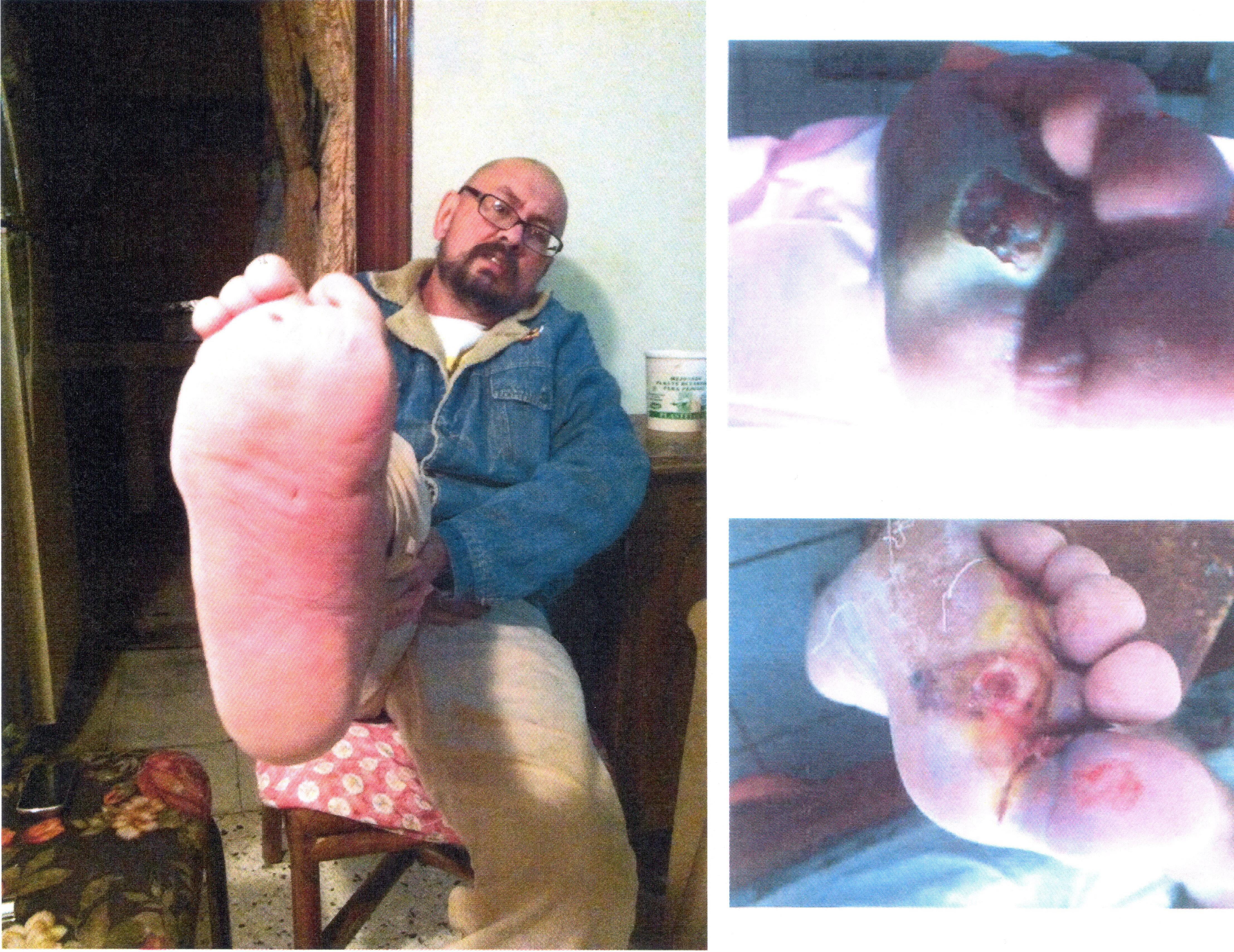 a distancia, poniendo vendas ensangrentadas en una vasija con agua y sulfato ferroso, evitando